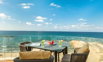 The highlight of this penthouse is the private rooftop jacuzzi, where you can unwind while taking in panoramic ocean vistas. The spacious balcony is perfect for outdoor relaxation, featuring dining space, sun loungers, and elegant garden furniture, ideal for enjoying meals with the sea as your backdrop.