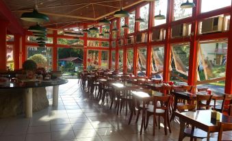 A pousada conta com um espaço legal e recreação boa. O jardim é bem cuidado. Tem várias piscinas, um lago com vários peixes, sapos, quadra de futebol, de vôlei de praia e uma sala de jogos. Ficamos em um chalé de dois quartos, com 2 banheiros e chão de vidro e uma lareira, muito legal. O ponto que não curtimos foi a comida. Além de poucas opções, a sobremesa de vez em quando não tinha reposição e eram sem sabor, alguns itens do buffet também acabavam e o cardápio era bem “simplesinho”.